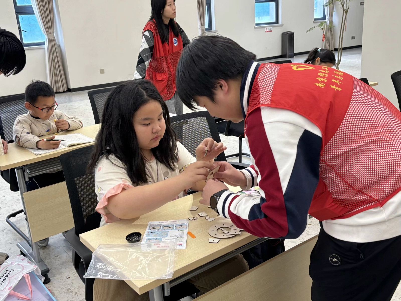 在充满挑战的组装环节,孩子们分成一个个小团队,手持螺丝刀、镊子等工具,对照着说明书,小心翼翼地开始了智能语音飞船的组装之旅。他们专注致志,遇到难题时积极求助于社工和同伴。热情的志愿者们穿梭在各小组之间,耐心指导,确保每个孩子都能顺利完成挑战。经过一番努力,一艘艘承载着孩子们梦想的智能语音飞船逐一亮相。当孩子们对着声音传感器发出“开灯”指令时,飞船上的LED灯瞬间亮起,那一刻,孩子们的喜悦与成就感溢于言表。