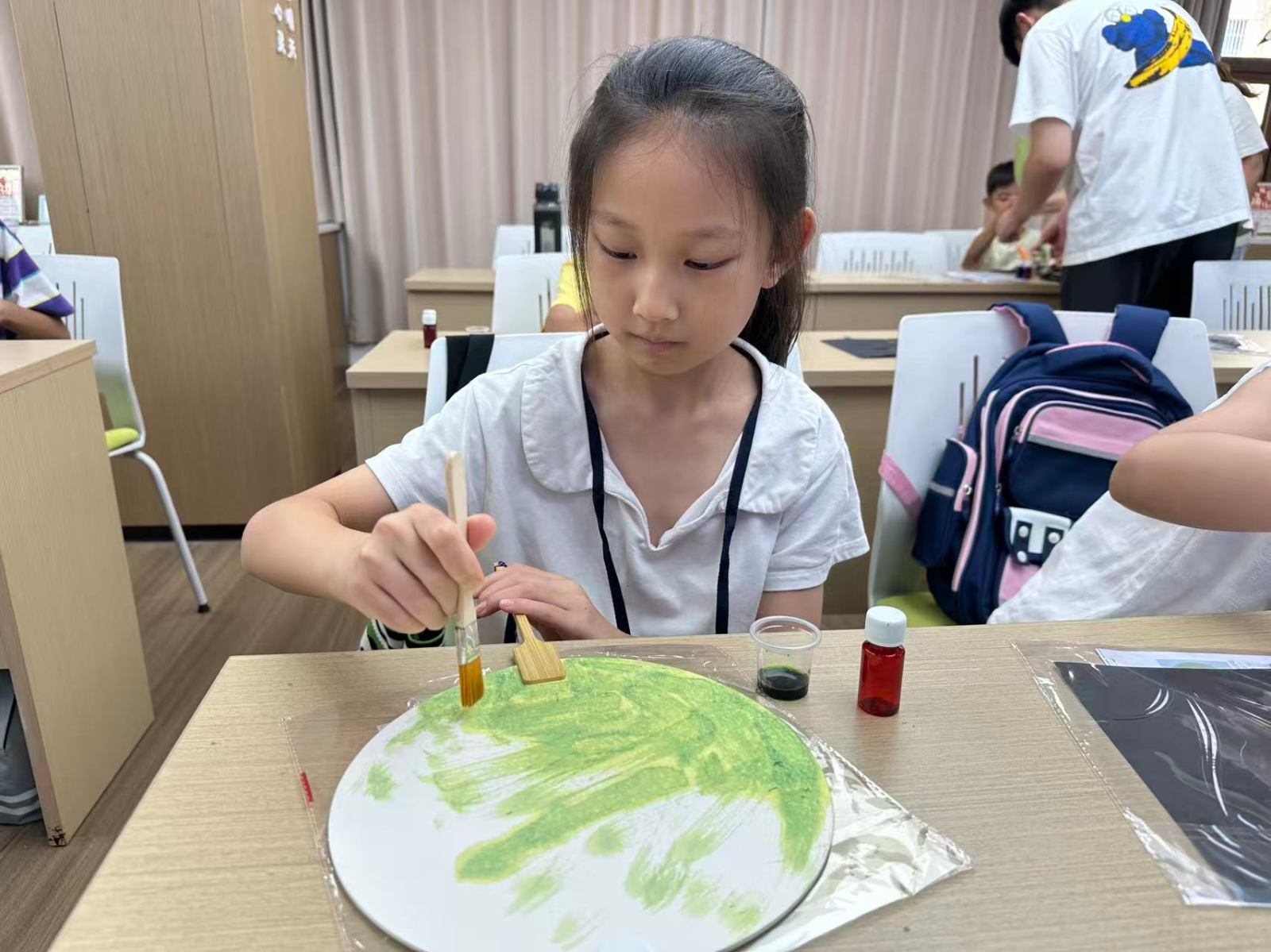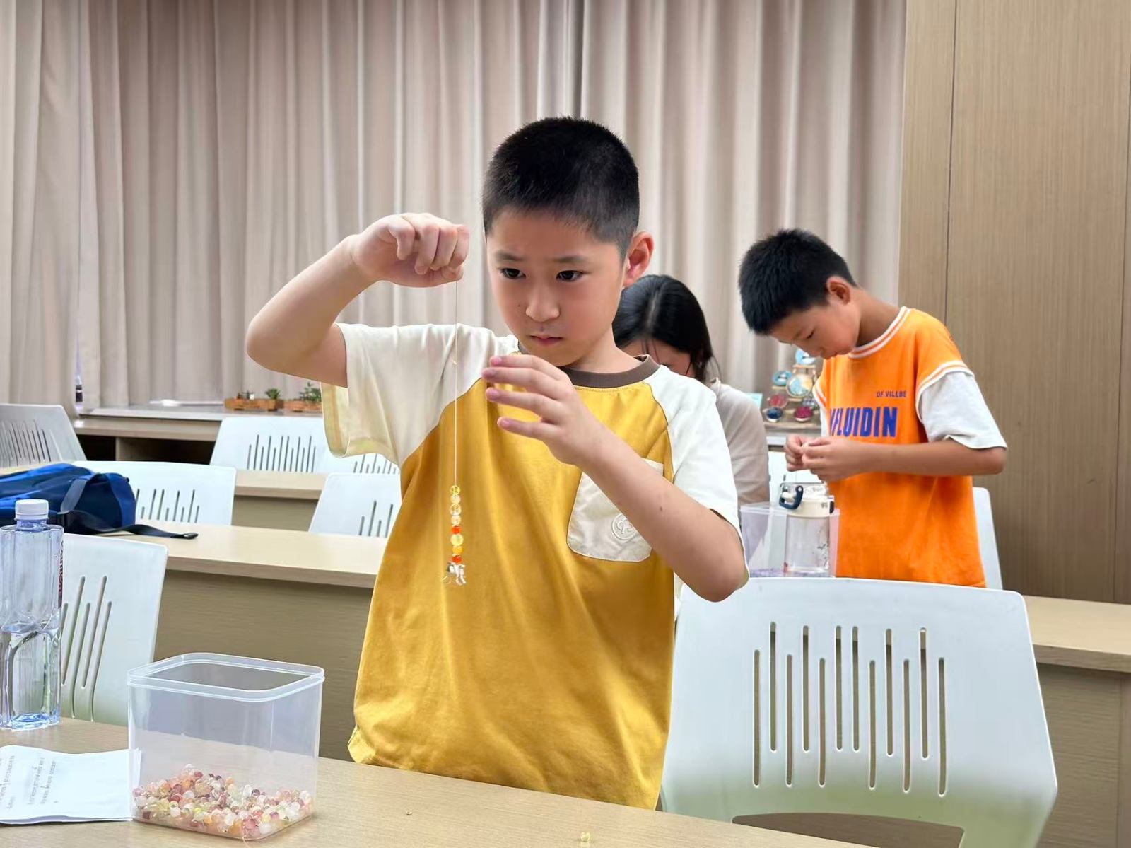 最受孩子欢迎的当属每天2小时的手工课程。非遗扎染课上,孩子们围坐在一起,拿着白色小包蘸取染料,“我想染出蓝天白云的样子!”三年级的小雨举着作品向社工请教,社工手把手指导他调整染色角度;蓝晒团扇制作时,孩子们挑选喜欢的花样铺在扇面上,再覆盖感光纸,阳光下等待的间隙,大家兴奋地分享自己想呈现的图案;DIY贝壳肌理沙画环节,孩子们互相交换不同形状的贝壳,“你的小海螺借我用用,我给你我的彩色细沙!”合作声此起彼伏;宋锦风铃制作中,当穿好丝线的风铃随风发出清脆声响,孩子们纷纷举起作品展示,脸上满是成就感。这些互动满满的手工活动,不仅让孩子发挥想象、提升动手能力,更在协作中培养了耐心与专注力。
