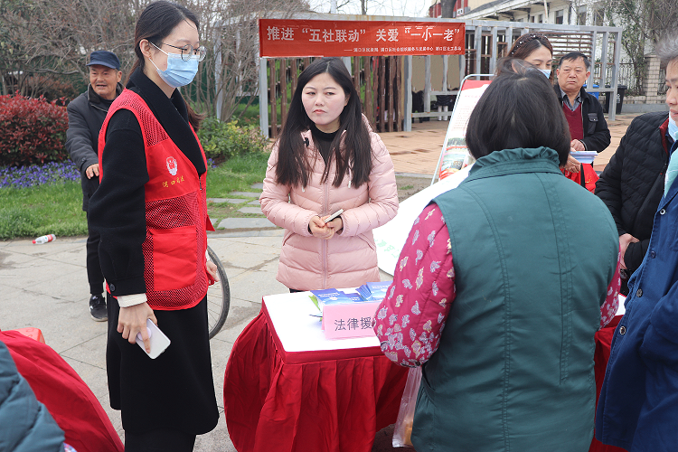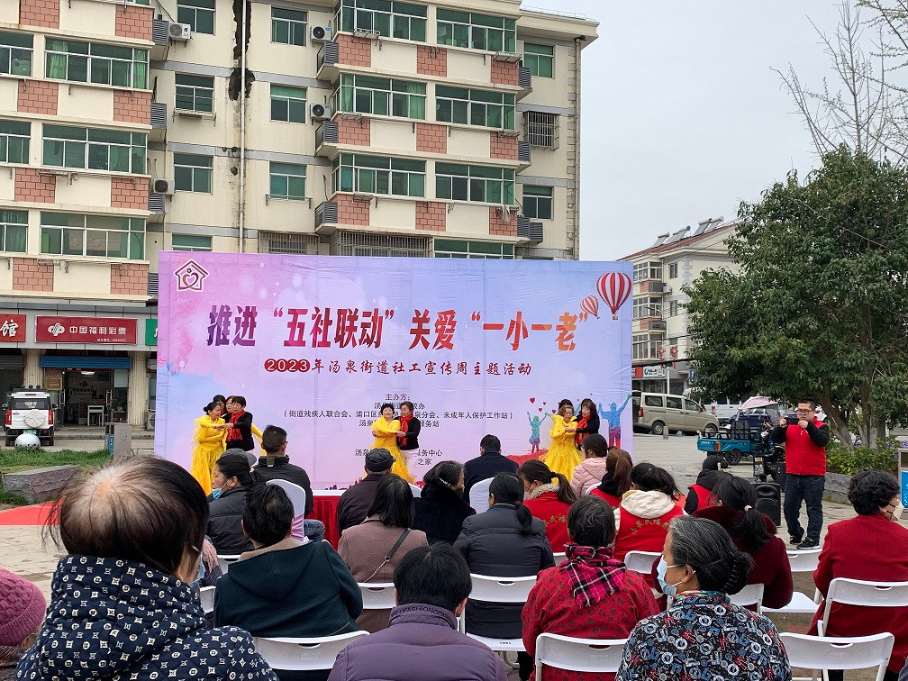 在宣传活动期间,区社会组织服务与发展中心及区社工总站联合南京市江北新区明德社会工作服务中心、南京市浦口区汤泉街道民福养老服务综合中心以及汤泉街道社工站,围绕“推进五社联动  关爱一小一老”主题,通过政策宣传、社区居民服务、广场活动等多种方式,深入居民群体宣传社会工作,树立社会工作专业形象,打造社会工作发展的社会氛围,发挥社会工作专业力量在推进“五社联动”  关爱“一小一老”中的作用。