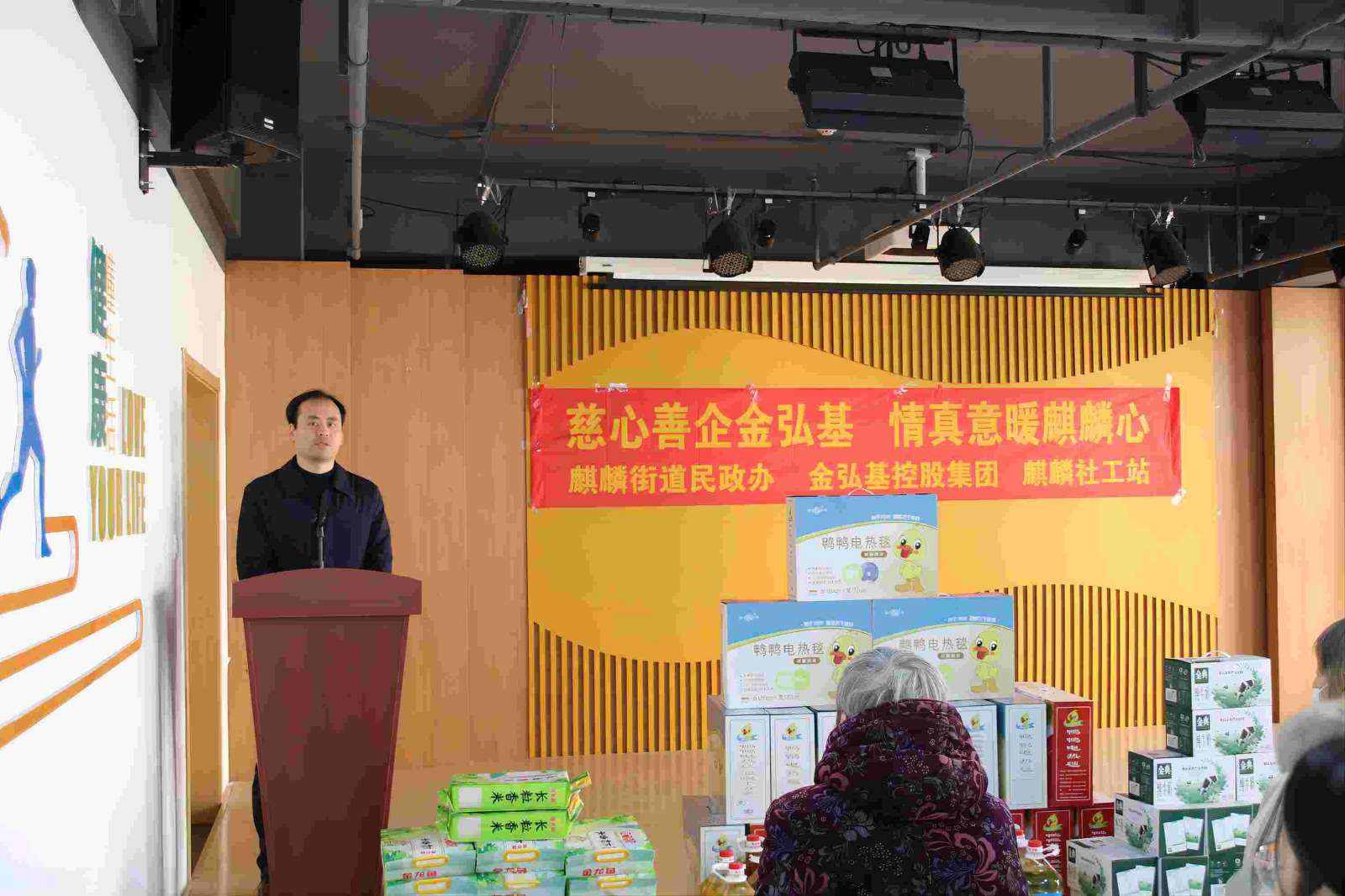 活动伊始,金弘基集团副总经理倪兵代表公司全体员工向居民送上新春祝福,并表示很荣幸能连续四年向麒麟街道进行捐赠,多年来金弘基持续专注公益事业,关心弱势群体的生活状况,接下来将继续用实际行动诠释关爱与温暖。